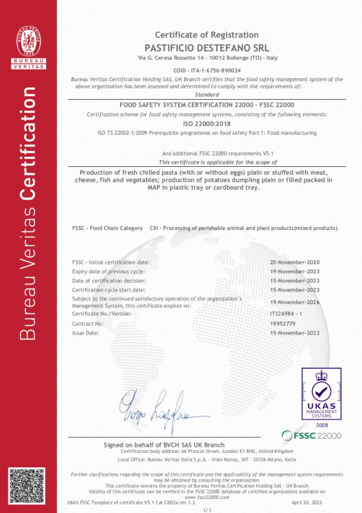Today, Pastificio Destefano is certified by the new FSSC 22000, one of the leading international quality certification systems in the food production, storage, distribution, catering, and retail and wholesale sectors.